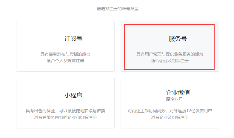 2、選擇公眾號的注冊賬號類型,主要分服務(wù)號和訂閱號,這里以服務(wù)號為例