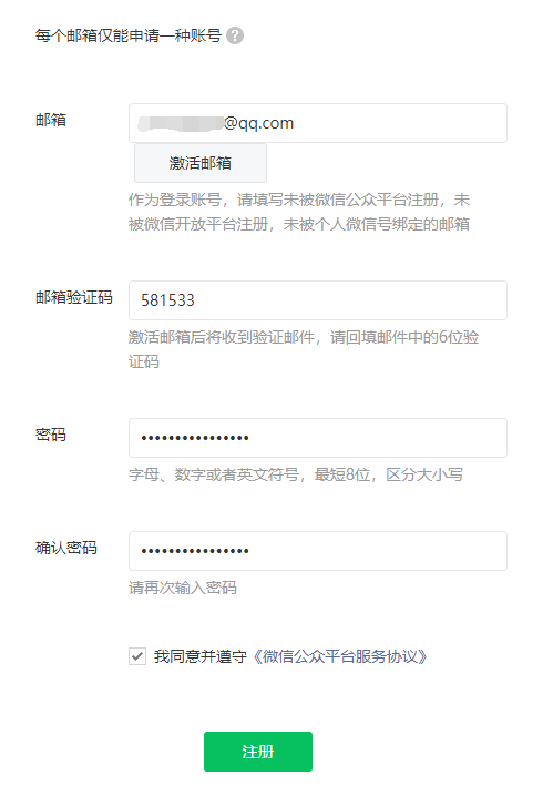 3、用從未注冊過微信公眾號的郵箱賬號來注冊,會發(fā)送激活碼到郵箱,輸入激活碼和密碼,就能注冊成功公眾號