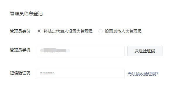 6、管理員信息登記,可以是法人,也可以是法人授權(quán)的管理員,輸入手機(jī)號碼和驗(yàn)證碼
