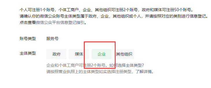 4、選擇賬號主體類型,政府選擇政府,企業(yè)就選擇企業(yè),這里以企業(yè)為主