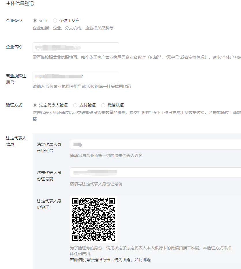 5、主體信息登記,按照營業(yè)執(zhí)照上的信息來填,公司名稱還有營業(yè)執(zhí)照號碼,然后法人掃碼驗(yàn)證