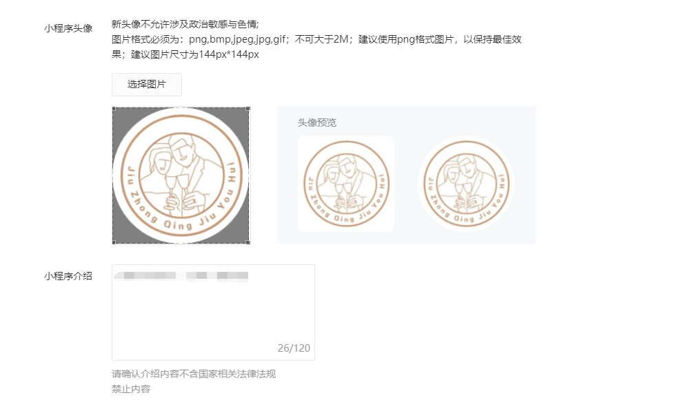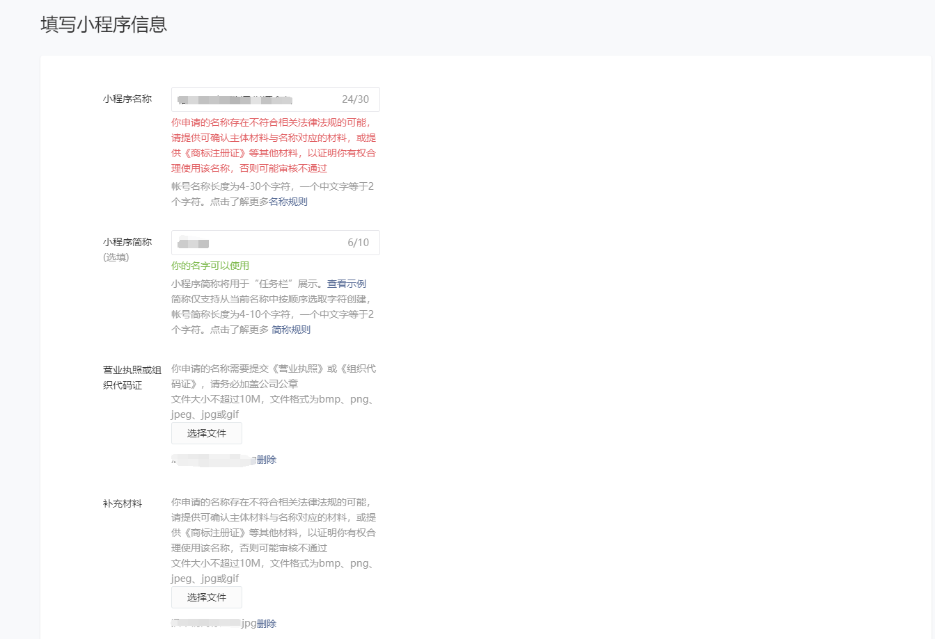 小程序名稱需要慎重,有些敏感字眼都是無法使用的,測試到沒有紅字提示即可,然后上傳營業執照等補充材料,上傳頭像、填寫介紹等