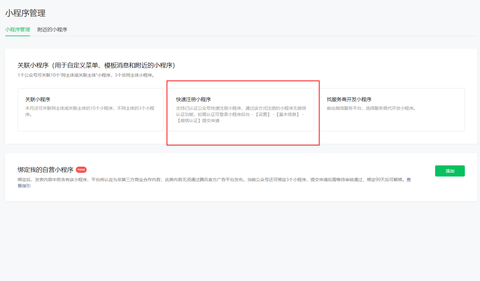 點擊開通之后,在小程序管理里面選擇“快速注冊小程序”,這是支持已認證的公眾號快速注冊渠道,如果有其他地方可以注冊小程序,可以選擇第一個關聯小程序