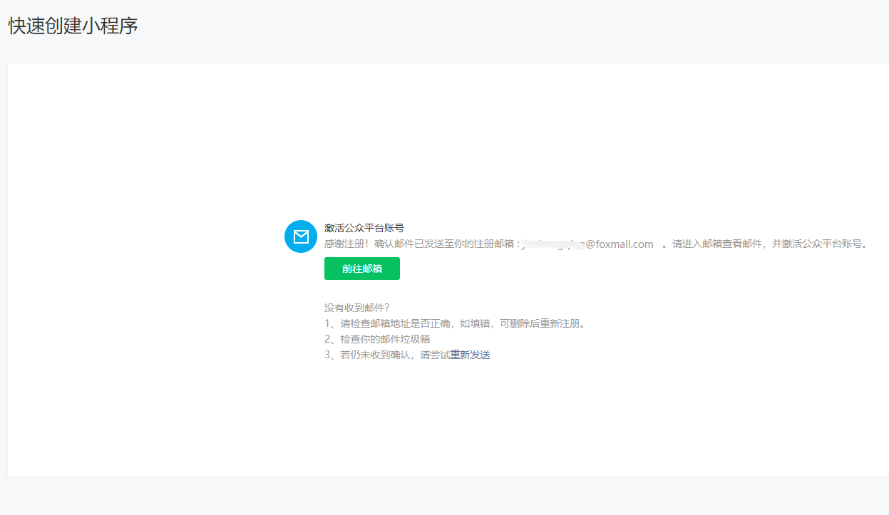 填寫完賬號和密碼之后,系統會發送激活郵件到郵箱,用戶需要到郵箱里面激活小程序,跳轉新頁面