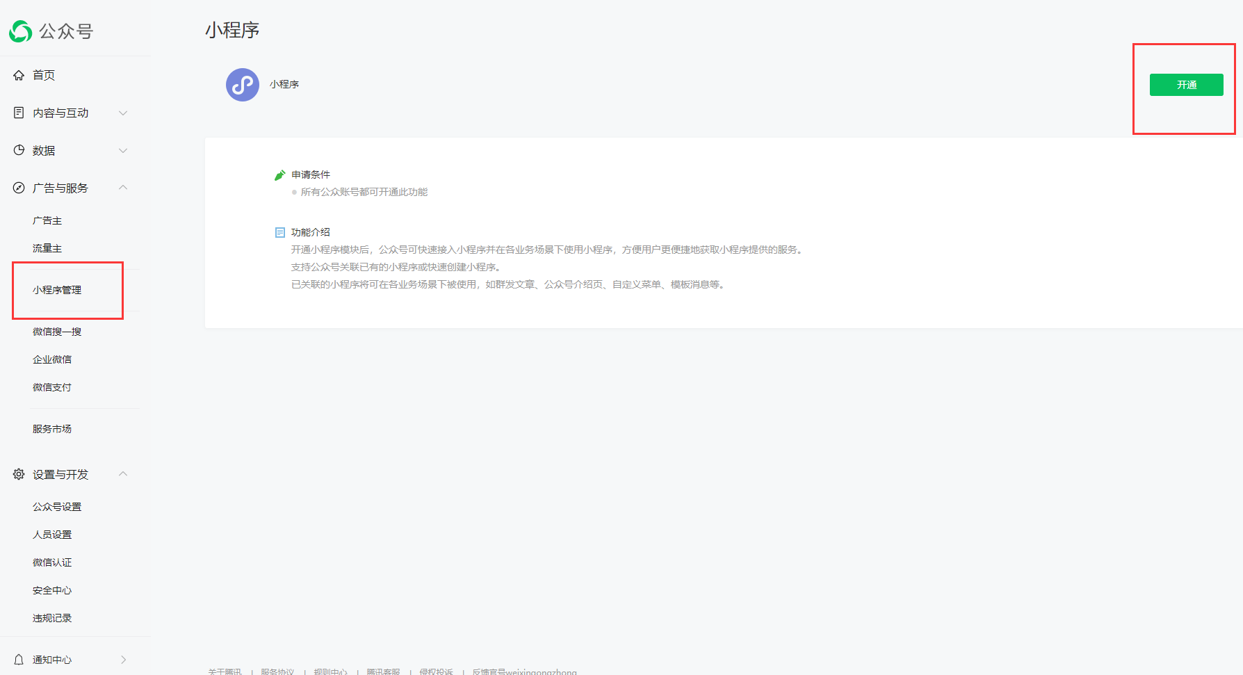 首先掃碼進入公眾號后,點擊左側的廣告與服務里的小程序管理,選擇右上角的開通小程序